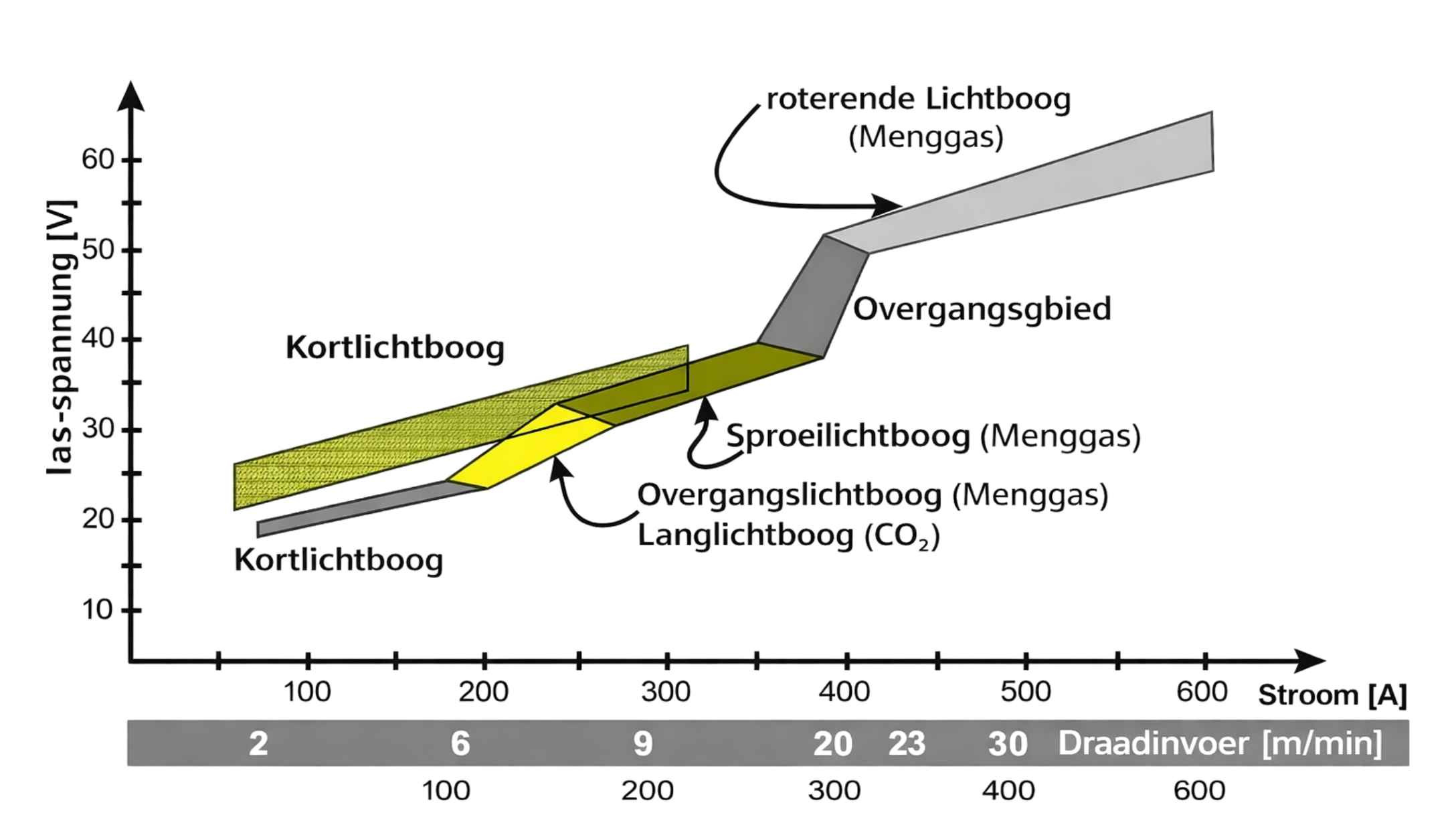 De hierboven weergegeven grafiek toont de typische werkgebieden van de verschillende boogsoorten. Belangrijk: de overgangen zijn niet abrupt, maar verlopen vloeiend. Het doel is om een stabiel booggebied nauwkeurig in te stellen en instabiele zones te vermijden.